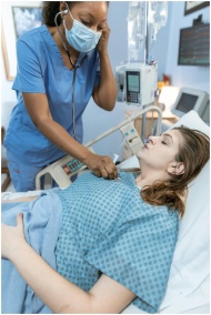 A nurse in scrubs caring for a patient in a hospit