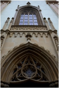 A detailed view of the Gothic architecture at St. James Basilica, Levoca, Slovakia.