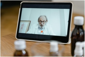 Elderly male doctor in white coat on a digital tablet screen during a virtual medical consultation.