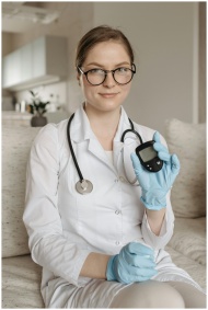 A female doctor with eyeglasses and gloves showcasing a glucometer indoors.