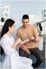 A doctor discusses a diagnosis with a patient in an ophthalmology clinic.