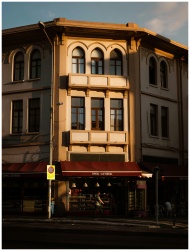 A charming old building with shops at sunset in İzmir, showcasing architecture in warm light.