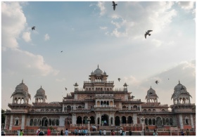 Stunning view of the historic Albert Hall Museum in Jaipur with birds flying above.