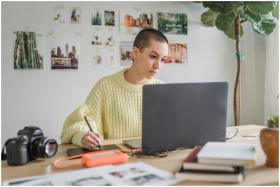 Young woman concentrating on study at home with la