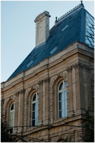 Elegant historic French architecture with detailed stonework and slate roof in Paris.