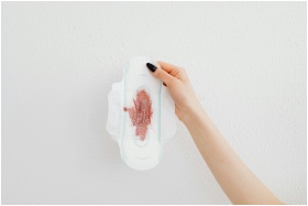 A close-up image of a hand holding a menstrual pad with menstrual blood.