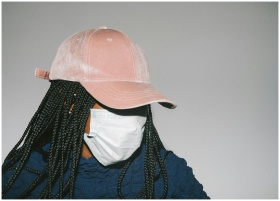 A contemporary portrait of a woman with braided hair wearing a face mask and cap against a neutral background.