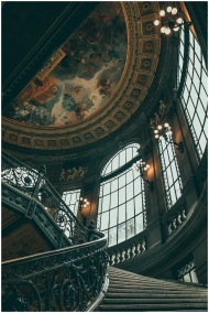 Beautiful low-angle view of the ornate interior and ceiling art of the Mexican National Art Museum in Mexico City.