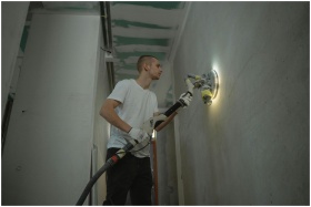 A man sanding an interior wall with an automatic sanding tool during renovation work indoors.