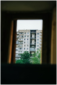 View of a decaying apartment building through a window in Tbilisi, Georgia.