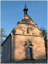 A picturesque baroque chapel bathed in winter sunlight, surrounded by a serene natural landscape.
