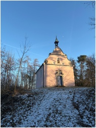 Serene chapel set in a snowy forest under a clear winter sky, perfect for peaceful reflection.