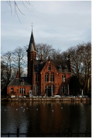 Scenic view of a Gothic building reflected in a canal in Bruges, Belgium.