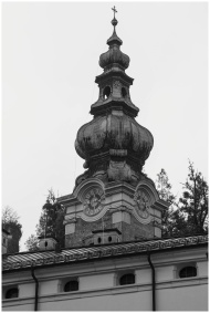 Black and white image of a historic church tower in Salzburg, Austria.