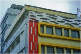 Close-up of a modern building facade featuring red, yellow, and white elements in an urban setting.