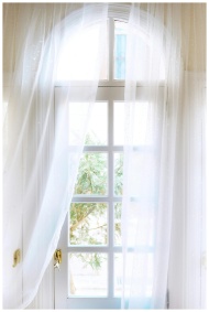 Spacious light house with white entrance door with windows and golden handle located under transparent curtains in daylight