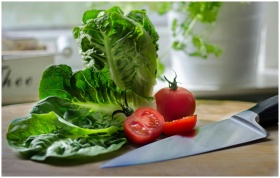 Close-up of lettuce, tomatoes, and knife on a kitc