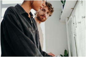A young couple engaging in a modern kitchen setting, fostering togetherness and lifestyle.