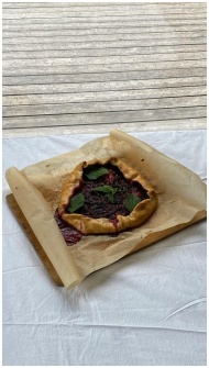Close-up of a homemade rustic berry galette on par