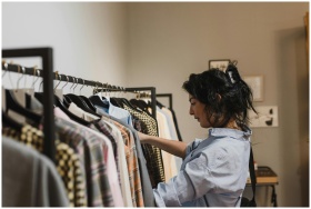 A woman exploring clothing options in a stylish bo
