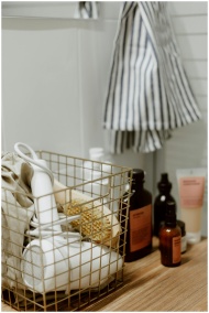 Close-up of a bathroom counter with a basket holdi