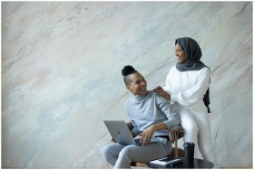 Joyful young ethnic friends in casual clothes using contemporary netbook while sitting on comfy chair and looking at each other with happy smiles