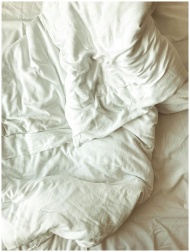 Close-up of soft, wrinkled white bed linen in a sunlit room, offering a cozy atmosphere.