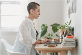 Woman using laptop at home office, surrounded by p