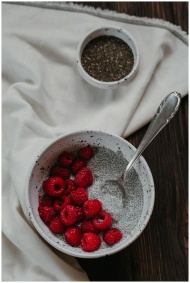 Chia pudding topped with juicy raspberries in a rustic bowl, perfect for a healthy breakfast.