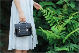Close-up of a woman holding a black handbag, wearing a striped dress, beside lush green plants.