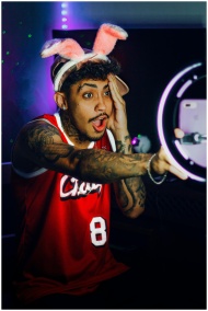 Young man posing indoors with rabbit ears and red jersey capturing a selfie.