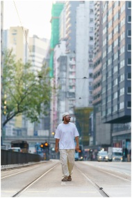 A man casually strolling through a busy street in downtown Hong Kong, capturing urban life.
