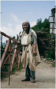 An elderly woman carries firewood along a rural path in Himachal Pradesh, India, depicting traditional lifestyles.