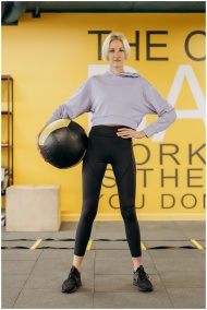 Woman holding a medicine ball in a gym, showcasing strength and focus.