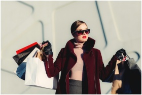Stylish young woman in sunglasses carrying shoppin