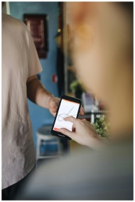 An individual interacts with a smartphone in a lig