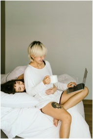 A couple sharing a cozy moment in bed, enjoying a laptop and coffee.