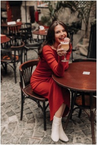 Smiling woman in red dress enjoying a sophisticated drink at a stylish outdoor cafe.