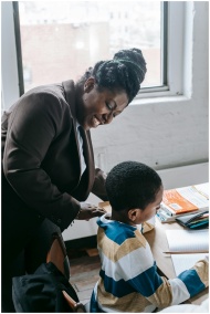 High angle of smiling adult ethnic female tutor teaching attentive little boy solving task during lesson in classroom