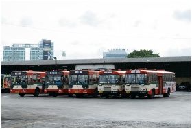 Five public buses lined up at a bus terminal in Bangkok, Thailand.