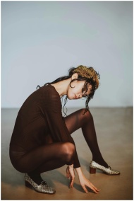 A woman in a chic outfit poses artistically indoor