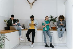 Casual and diverse colleagues using gadgets in a modern office kitchen area.