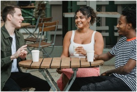 Cheerful young multiracial friends in casual clothes smiling while resting in outdoor cafe with cups of takeaway coffee and communicating