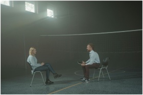 A man and a woman engage in a therapy session in a smoky indoor setting, sitting apart in a large room.