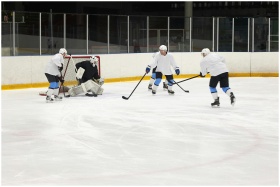 Four ice hockey players compete fiercely on an ind