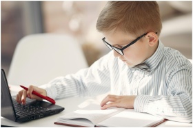 A young boy in glasses and bow tie diligently studies with a laptop at a table indoors.