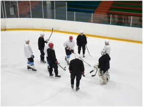 A team of male ice hockey players gathers on the rink for practice, showcasing teamwork and sportsmanship.