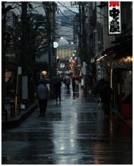 Atmospheric night scene in Shibuya, Tokyo showcasing people with umbrellas on a rainy street.