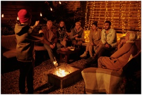 Boy acting out charade word while playing with friends and family around backyard bonfire at night