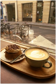Cozy morning in a Paris cafe with cappuccino and chocolate cake.